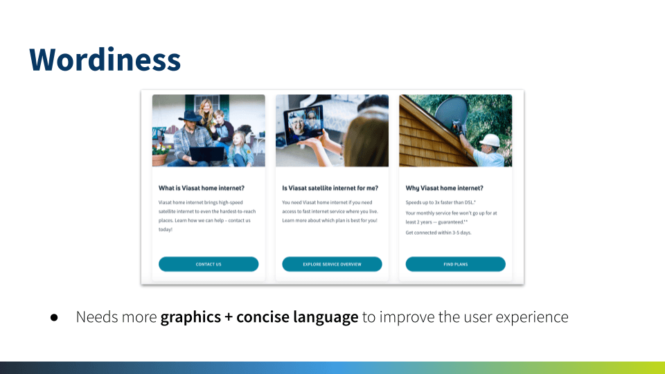 The site buried Viasat's actual advantages (like rural coverage) under generic corporate content. When you're selling internet to someone who has limited options, you need to lead with why you're their best choice. Instead, users had to wade through pages about corporate structure and satellite specs.